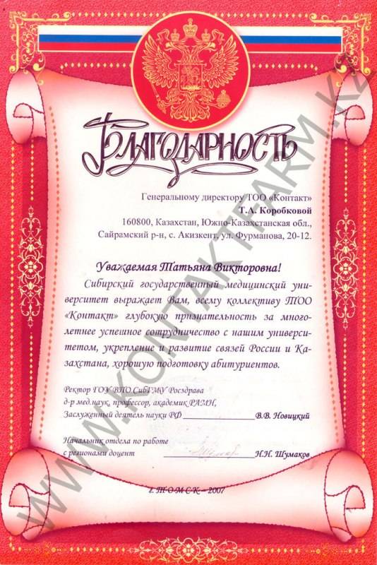 Сибирский государственный медицинский университет выражает Вам, всему коллективу ТОО"Контакт" глубокую признательность за многолетнее успешное сотрудничество с нашим университетом и развитие связей России и Казахстана, хорошую подготовку абитуриентов.