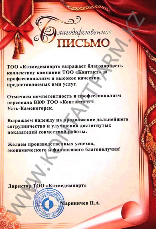 ТОО "Казмедимпорт" выражает благодарность коллективу компании ТОО "Контакт" за профессионализм и высокое качество, предоставляемых ими услуг. Отмечаем компетентность и профессионализм персонала ВКФ ТОО "Контакт" в г. Усть-Каменогорск.