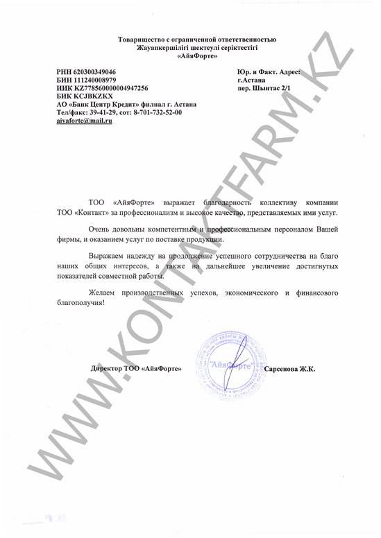 ТОО "Айя Форте" выражает благодарность коллективу компании ТОО "Контакт" за профессионализм и высокое качество, предоставляемых ими услуг.